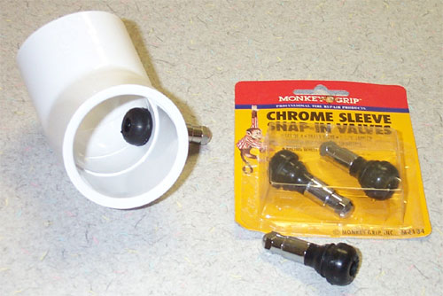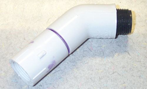 The placement of the air valve reflects my attempt to avoid small radii curves but leave the endcap valve-free to use as a stock. I settled on the left side of the 1.5" 45 bend as a reasonable location. Making sure to avoid the socket areas where the pipe and bushing will interfere, I drilled a 1/2" hole through the fitting and cleaned it up with sandpaper. A little silicon spray on the snap-in valve and a lot of pushing/tugging got it into place. No goop/epoxy/whatever required - the fit is airtight all by itself.