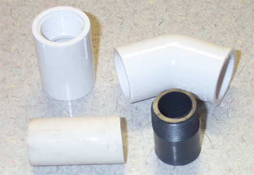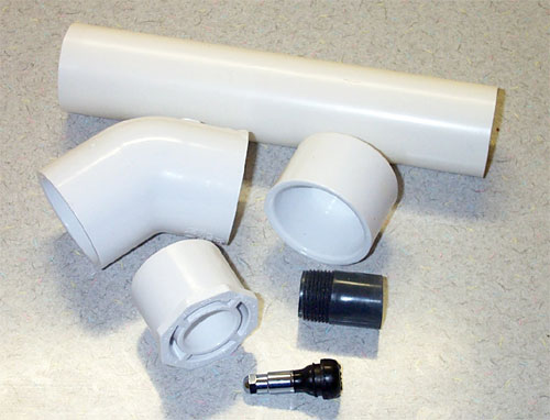 Here are the parts needed for the air tank assembly. The small piece of SCH80 is cut from one end of the 6" Riser. I cut it an inch past the threads to leave enough pipe to glue into the bushing.