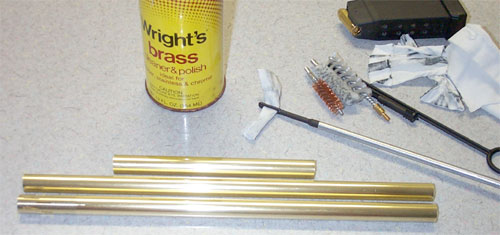 With the air delivery system complete I started on the barrel. I was concerned about using two 12" pieces of brass to form a 24" barrel but it's difficult to find 36" K&S brass tubing so I did everything I could to make two pieces act like one. First I got out my (.45 caliber - pretty good fit) gun cleaning kit and used brass polish and cotton cleaning pads to carefully polish the inside of both pieces of 9/16" brass. I then rounded the inner edge of the rear end of the frontmost piece of brass so that darts wouldn't catch on anything sharp at the join area. At that point, it's a simple matter of sliding 6" of 19/32" brass over the two 9/16" pieces, centering it over the join area, and using electrical tape to secure it. I was careful at this point to insure that the two pieces of 9/16" brass were very tightly held together - the 19/32" piece takes care of the alignment.