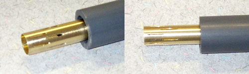 Here are two crappy pictures of the porting I did on the muzzle end of the barrel. Ignore the SCH80, it's just in the picture to illustrate the relative fit of the brass in the PVC. The porting is a two-row staggered slit design with 6 slits per row. When mounting the brass in the SCH80 I wrapped the brass in electrical tape until it was a snug fit, but left the front 3" of the barrel tape-free to allow the ports to exhaust through the gap between the brass and PVC. The picture DOES NOT illustrate the final position of the brass as I pushed it back until it was flush with the front edge of the PVC.