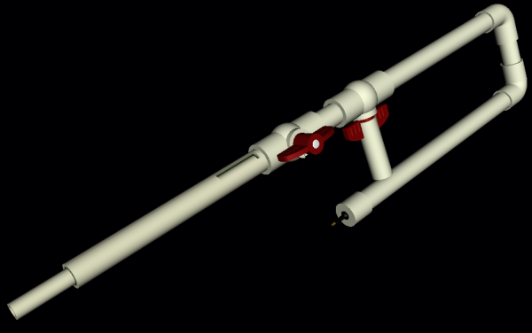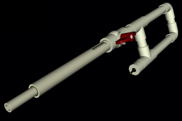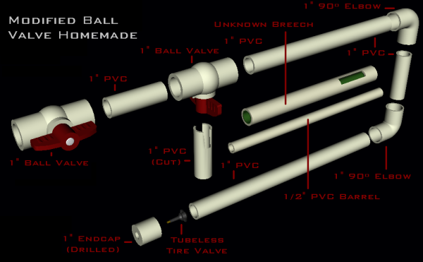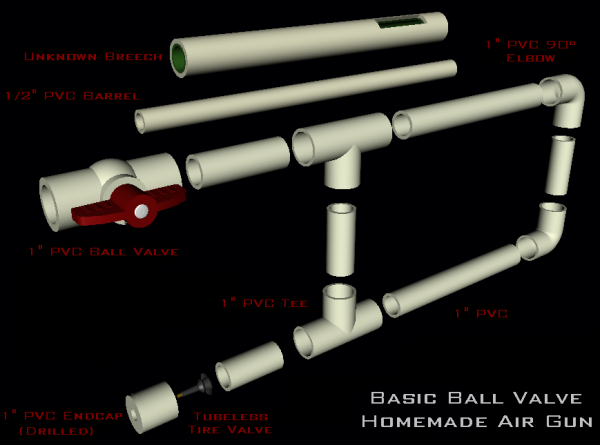This homemade design is an incredibly simple homemade air gun, using a ball valve as a firing trigger. I don't own one of these, nor do I intend to due to my dislike of ball valves, but this write-up is here to introduce a design to those who do not yet understand the operation of a basic homemade air gun. Basically, it's here to help those new to the field of Homemade Air Guns, utilized in Nerf. Feel free to play around with any concepts introduced in this write-up.