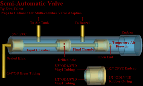 This is an adaption of the Advanced Pull Valve, with inspiration from Cadmond. Originally, this was made with two valves, the air-management one of which was called the "Goliath valve," in honour of nerfer Lemmypoo's idea of manual air regulation. However, Cadmond took this design and built it into one package, involving multiple chambers. Thus, I owe him some credit for this valve, though it's now been redesigned since then from a 4 O-ring design to a 3 O-ring design. He did, however, inspire progress in that direction with his horrible Paint diagrams. Either way, this valve basically allows air into the firing valve when it is at rest, and seals off the firing valve's connection to the main air tank, before opening the firing valve, when the trigger is pulled. So, pending the air source, PSI, and storage type, this valve allows for crudely regulated Semi-automatic fire. It's the best you can get for under $5!