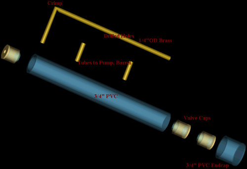 Now, grab your 1/4" Brass tube. Grab the smallest drill bit you can find, and drill one or two holes in the side of the tubing, making a sort of ring, just before where, the tubing in rest position, the hole will rest behind the middle plug's O-ring. Basically, you want it so when you push the tubing in, the hole will hop from one side of the O-ring to the other, allowing air from the Temporary Air Resevoir into the Barrel Chamber, and from there, out the barrel. Just look at the diag. Make sure the hole is smooth with some filing or very fine sanding.
