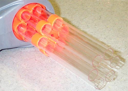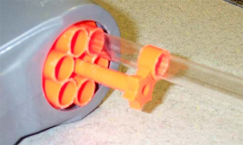Instead of cutting the barrels at 'the line' about 3/4 of the way back, I cut them 5/16" behind the line. This gave me enough of a barrel stub to work with and removed all of the inner layer of the barrel. Take care while cutting the barrels not to damage the rotation mechanism or get lots of plastic debris in the air tank.