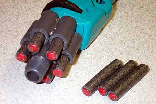 The ammo holder is made from scraps of SCH 80 hot glued in a ring so that it slides over the barrel. Using the ammo holder I can get off 7 shots in about 15 seconds. Not a bad ROF for a gun with this range and accuracy.