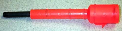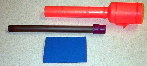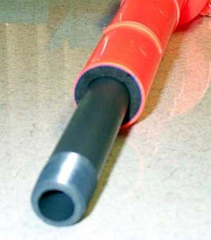 Here's the plunger assembly with the 11.5" SCH 80 barrel. The purple thing on the end is the pump end cap from my SM5k. Anything will work here - it's just to bridge part of the gap between the PVC and the orange tube. You want it to be totally airtight and epoxy won't bridge a 1/4" gap very well. The blue thing is a scrap from an old mousepad I had lying around. I rolled it around the barrel to keep it centered in the tube.