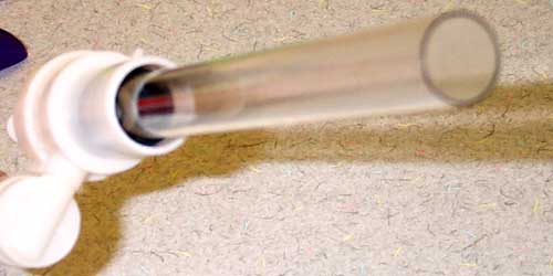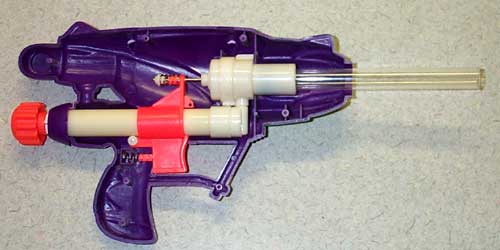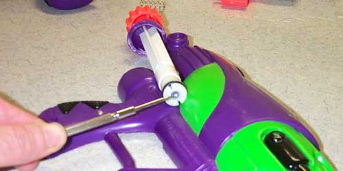 First I opened the gun by carefully prying off the plastic rings around the barrel and the pump tube. After opening it I plugged the overpressure release valve in the pump so as to achieve a higher pressure in the air tank. Simply place a dab of hot glue in the circular opening on the end of the pump tube - make sure it doesn't extend out beyond the plastic. After plugging the valve you will be able to blow your air tank with over-pumping so I'd stick to 3 or 4 pumps max.