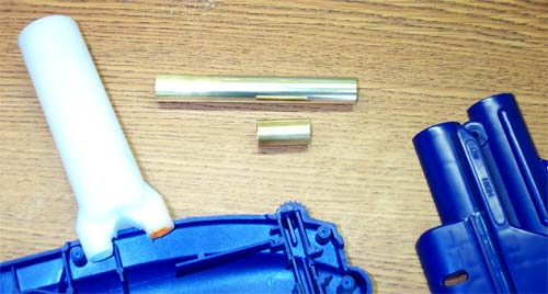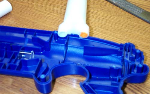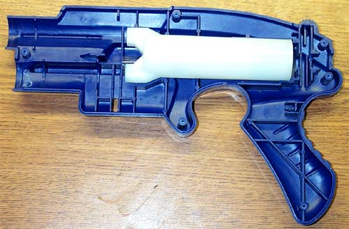 Here's a picture with the gun opened up and the barrels and selector assembly discarded. Without the valve attached to the front of it, the piston tube will slide back and forth in the case. There is also a rib of plastic immediately to the left of the top-left corner of the plunger tube that must be filed down to make way for the PVC.