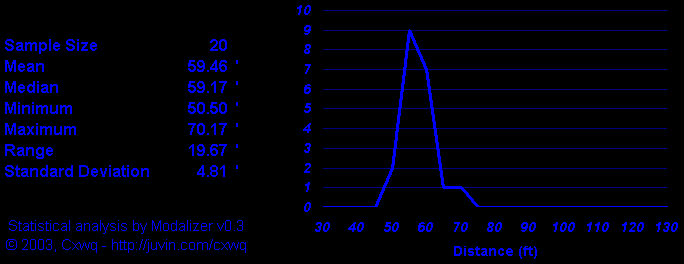 Range testing was performed with .25" steel shot weighted micro stefans. All shots were fired parallel to ground from a height of approximately 4.5'. Average dart skip on concrete was approximately 2-3'. Here's the Modalizer screencap chock full of statistical analysis goodness.