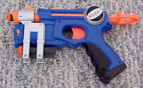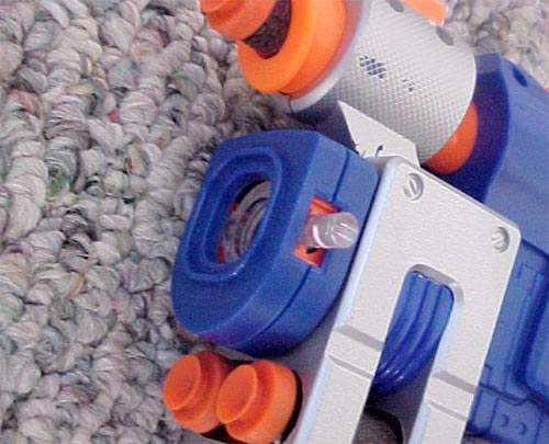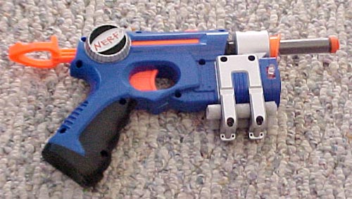I cut these ammo holders off, so I could fit the blaster in my pocket easier.. This is a small blaster, much smaller than the Tech Target. The ranges, again, are comparable to a Lock'n'Load, and it feels good, is incredibly cheap, and has a light on it. I hope you guys like this gun. It's cool, but I don't think I'm going to use it myself, not just yet anyways. I still can't put the LnL down. I don't think it has the range or power, but it is much more accurate (without the light), and the grip seems to melt into your hands. A steal for the price and simplicity of the mod. Enjoy.