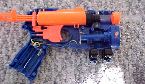 The plunger and barrel, however, were odd. It broke into quite a few pieces. It's simple to put it back together, though. You will notice that the plunger has a "cap" on it. Take it off, and the end of the shaft could knock your barrel out. You may want to drill a large hole in the middle of it for a better air path, I belive the blaster is already adequate. I left it in, and looked at the next piece. It was a small spring and pronged thing, some stupid air restriction, obviously. I did away with it.