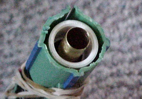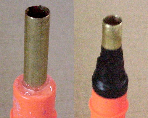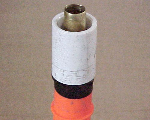 Take a 6" piece of 1/2" PVC, a 5-6" piece of 9/16 brass. Wrap electrical tape around both ends of the brass the nest it in the PVC. You know the drill. Let me note that the barrel in the pic is too short. Anything under 5" or over 6" is going to lose range.