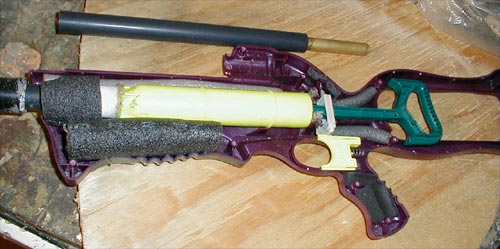 Once all of this is done, the gun can be put back together. You may notice that in my pictures there is no spring in the gun. The reason for this is that I accidentally broke my replacement spring, and refuse to use the original spring. I figured having a spring in the pictures weren't worth the extra time it would take me to get another. Another thing that you'll notice is that almost every crevise in my gun is filled with foam. I was annoyed when my ears rang after every shot, so I quieted up the gun a little by adding the foam. The foam above the yellow tube is backer rod, and the foam below is foam insulation for 1/2"-3/4" piping. The foam in the handle is just flat chunks of foam from the insulator. The important piece of foam is the one that goes over part of the front-most PVC coupler. This is a piece of the insulation foam I just mentioned, but it has been slit, and also cut into so that the screw ports aren't impeded. This foam keeps my barrel steady in the case.